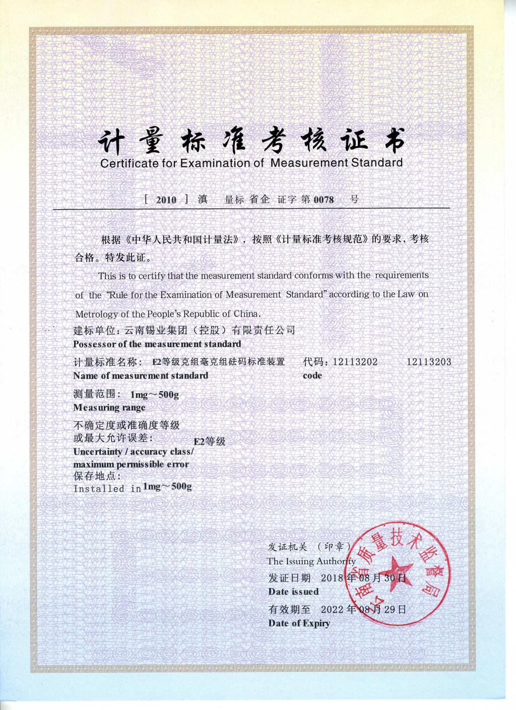 近日,云錫11項企業(yè)最高計量標準一次通過復查考核,獲得了由云南省質(zhì)量技術(shù)監(jiān)督局頒發(fā)的《計量標準考核證書》。